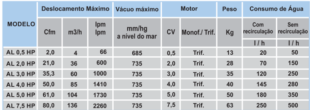 •Projeto compacto de alta eficiência e baixo custo, a bomba de Vácuo anel liquido modelo Al, opera por meio de liquido auxiliar (água) em alimentação constante. Seu acionamento é através de motor elétrico trifásico 220/380V - 60 Hz, fechado diretamente ligado a bomba.